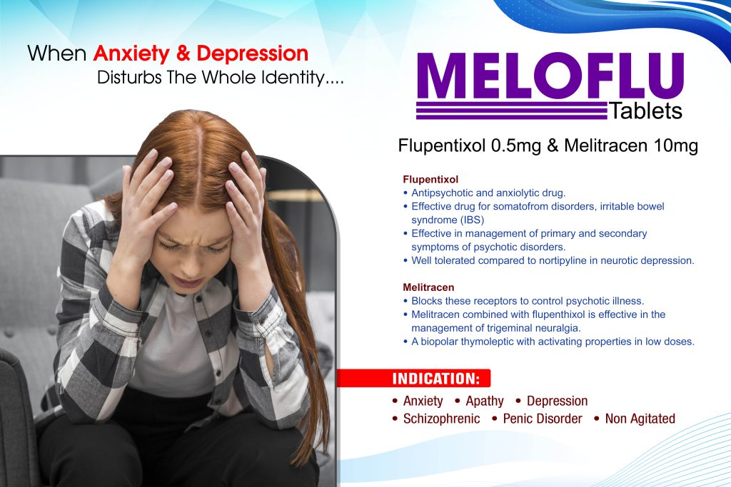 MELOFLU Tablets combine Flupentixol, an antipsychotic & anxiolytic drug, with Melitracen, a thymoleptic antidepressant. Together, they provide effective management of anxiety, depression, somatoform disorders, and psychotic symptoms, while improving mood, sleep, and emotional balance.